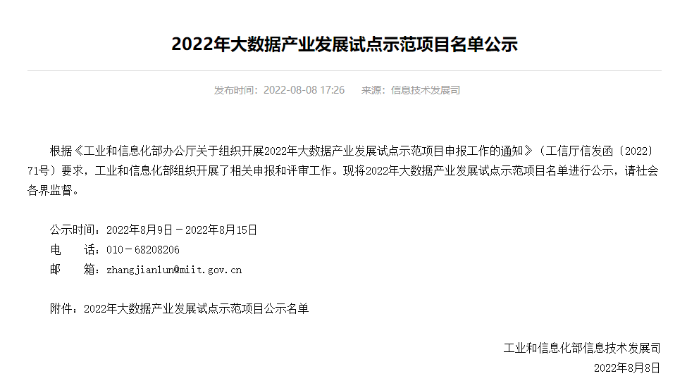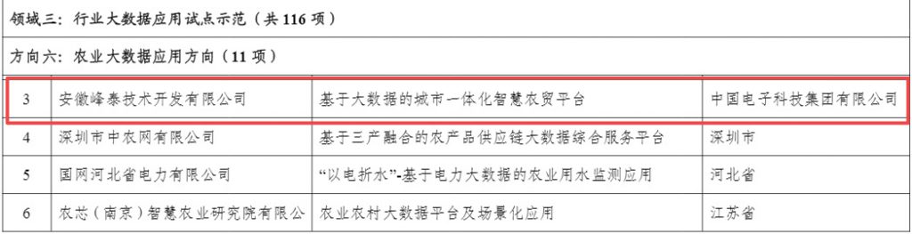 8月8日,工业和信息化部公布2022年大数据产业发展试点示范项目名单,电科峰泰以“基于大数据的城市一体化智慧农贸平台”项目成功入选行业大数据应用的“农业大数据应用方向”示范项目。