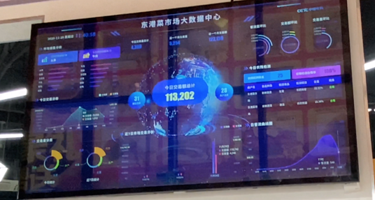 一走进东港菜市场,就能看到一个电子屏幕,上面显示着市场大数据中心,电子屏幕上显示着实时菜价,显示实时人流量、交易额、菜品等信息。