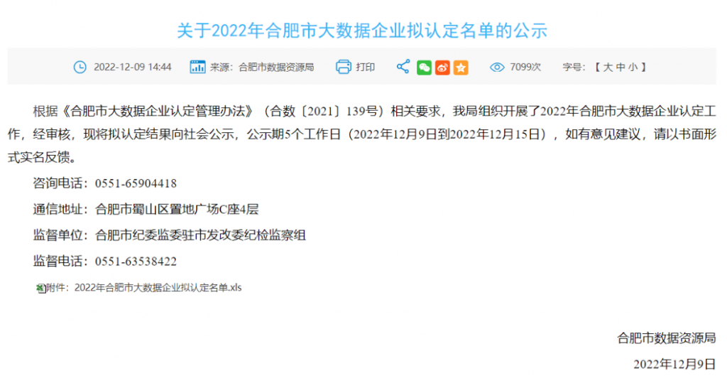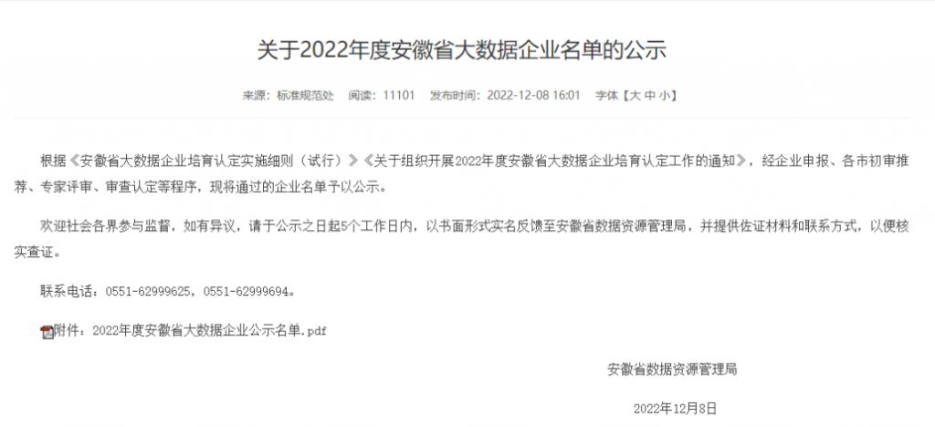 近日,安徽省数据资源管理局和合肥市数据资源管理局先后公布了2022年安徽省大数据企业名单及合肥市大数据企业名单,电科峰泰皆成功入选,获得了省/市大数据企业双认证。