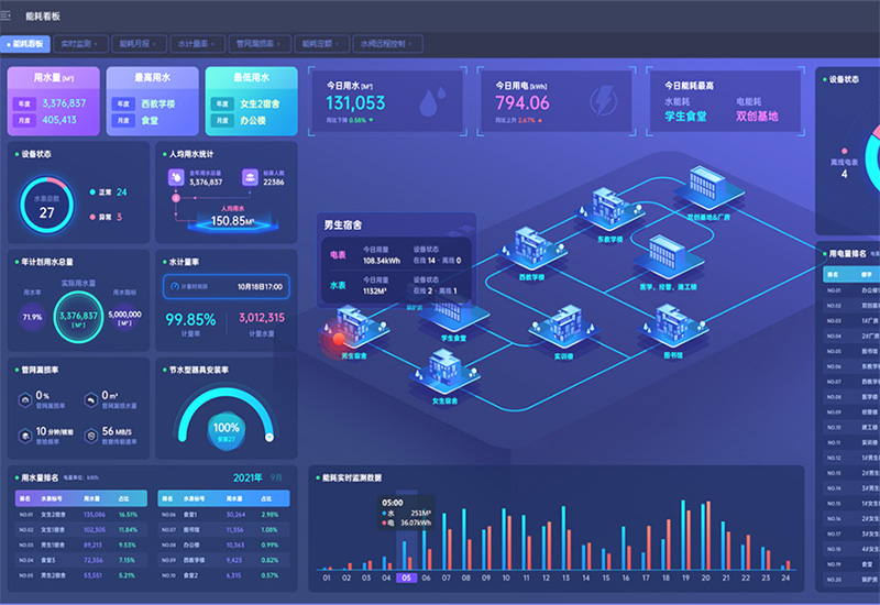 淮南联合大学为推进学校信息化、智能化高校的建设进程,建设节能高校三维能源管理平台。能源管理平台可实现对学校建筑分区分层进行水、电消耗量的监测与在线管控,提高学校能源的管理水平,建设节水型、节电型高校。