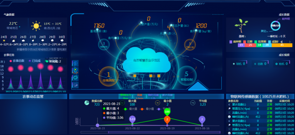 电科峰泰根据客户需求,对乌苏智慧农场统一规划设计并提供整体解决方案,实现智能化灌溉、科学施肥施药等农业生产的精准监测和智能控制,形成标准化的种植模式,不断提升农业精细化管理水平。