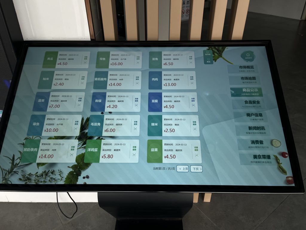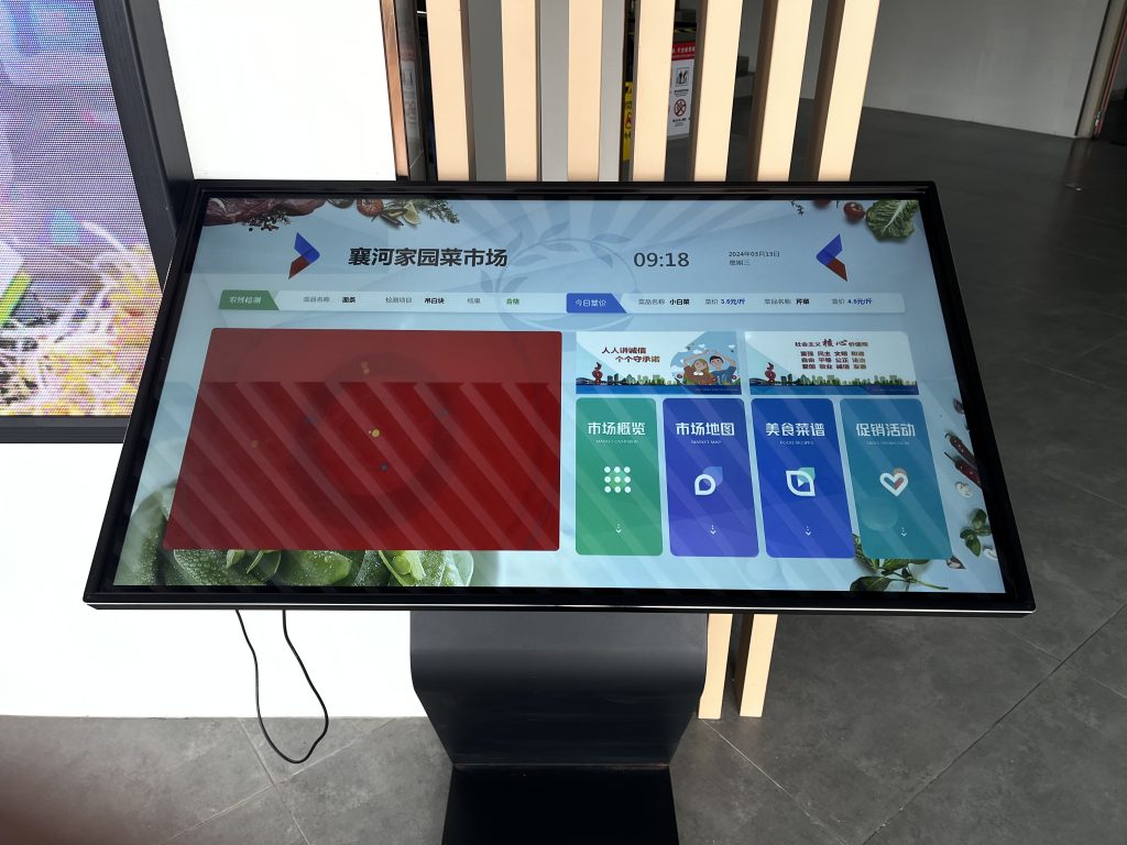 在瑶海区襄河家园菜市场入口处,立式触摸查询屏可一键查询市场概览、市场地图、美食菜谱、促销活动等信息,消费者可以直观、快速的了解市场情况。